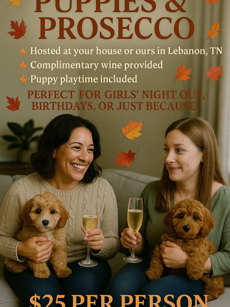 Imagine an afternoon spent surrounded by happy, wiggly Cavapoos while sipping on a glass of Prosecco and enjoying a charcuterie board. That’s the experience we’re creating with Puppies & Prosecco. It’s the perfect mix of playful and elegant—whether you’re celebrating a bachelorette party, hosting a birthday, or just looking for a memorable get-together with friends.